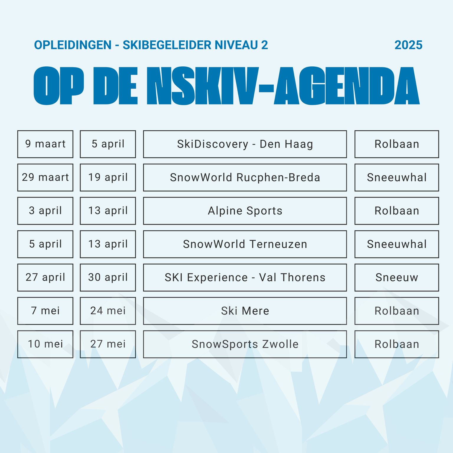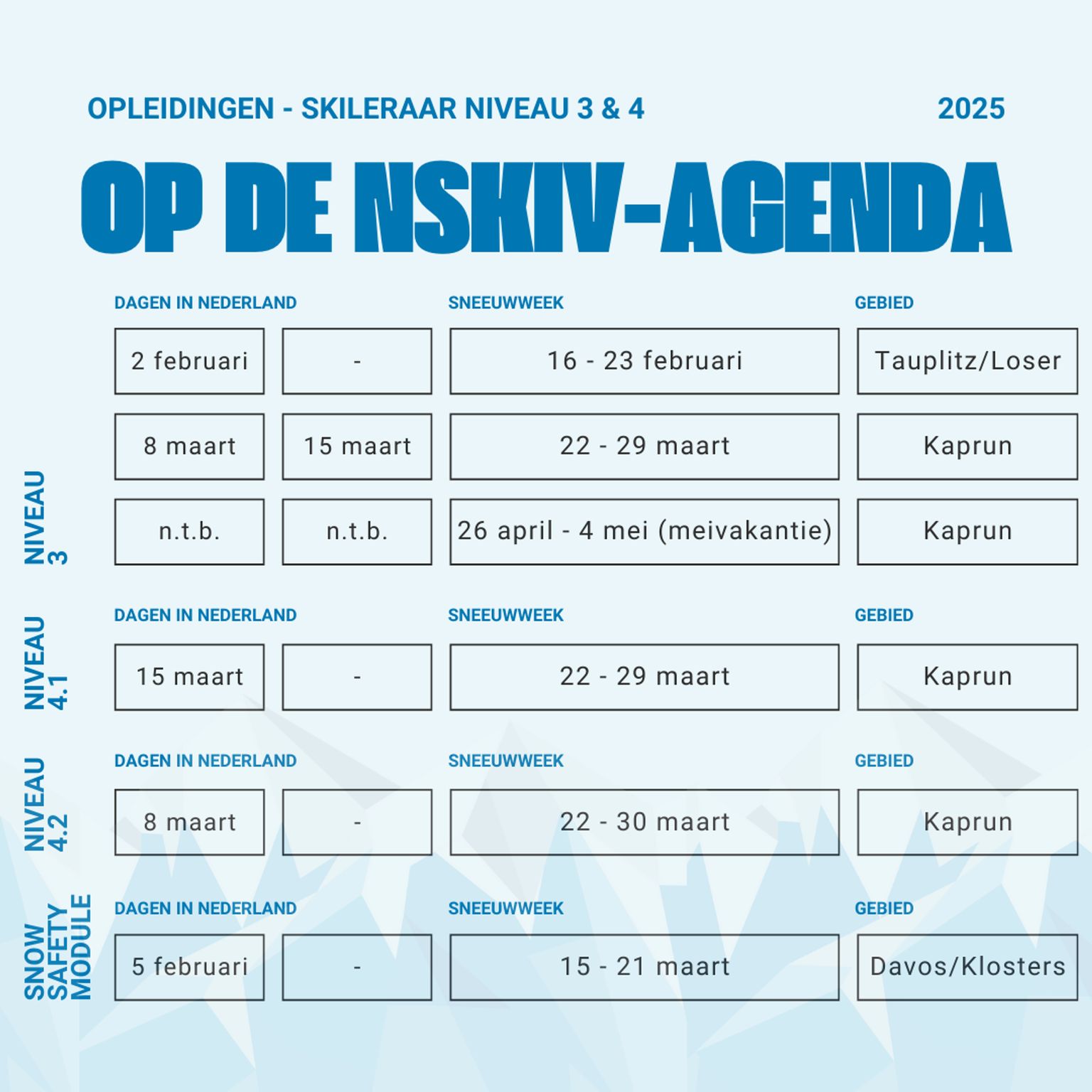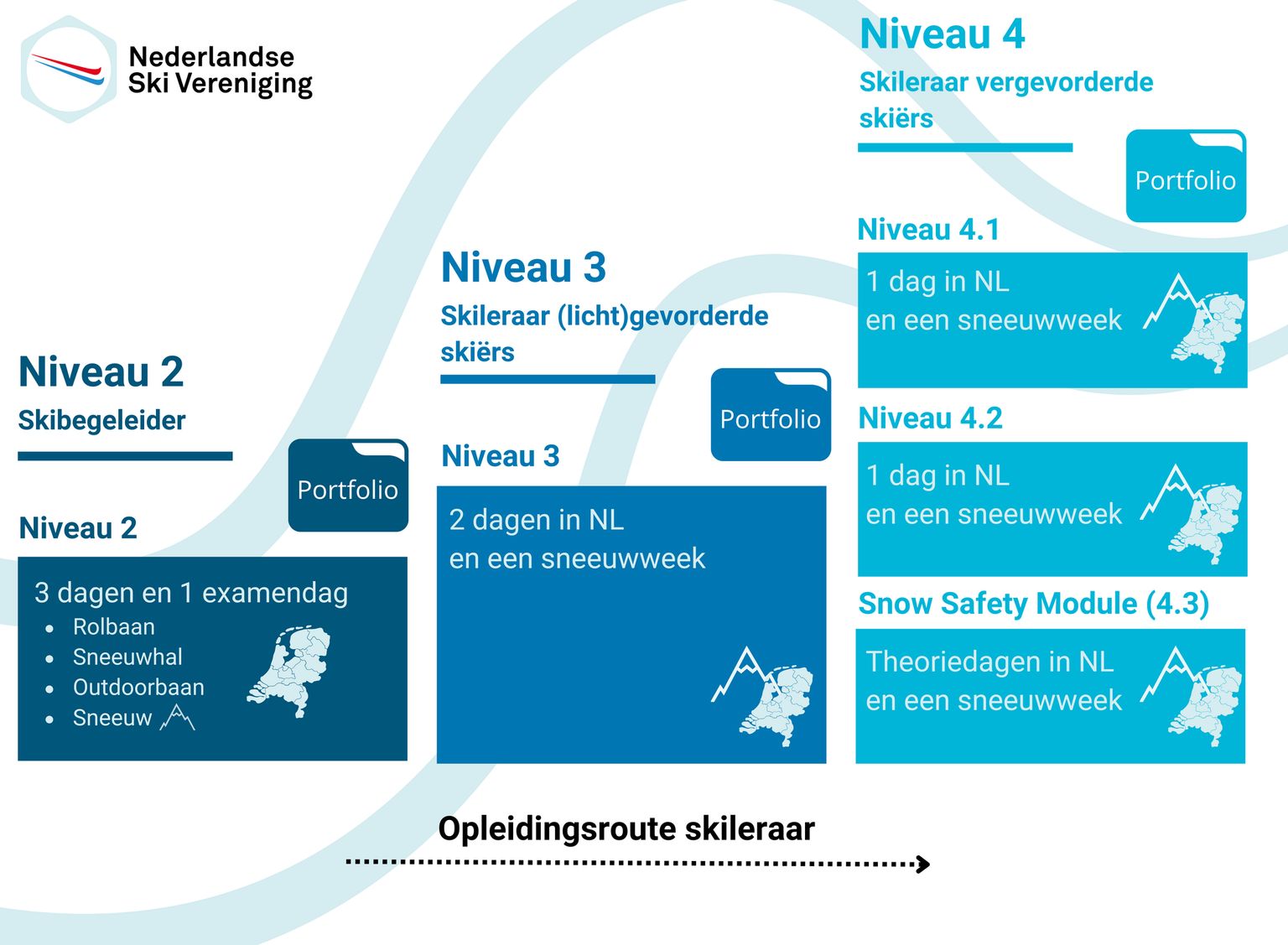 “De opleidingen van de Nederlandse Ski Vereniging staan voor kwaliteit, deskundigheid en onafhankelijkheid. Ons doel is om wintersporters de beste opleidingsmogelijkheden te bieden, onder leiding van ervaren bondsopleiders. Onze opleidingen worden door cursisten gemiddeld beoordeeld met een 8,8. Dat is een resultaat waar we trots op zijn!”