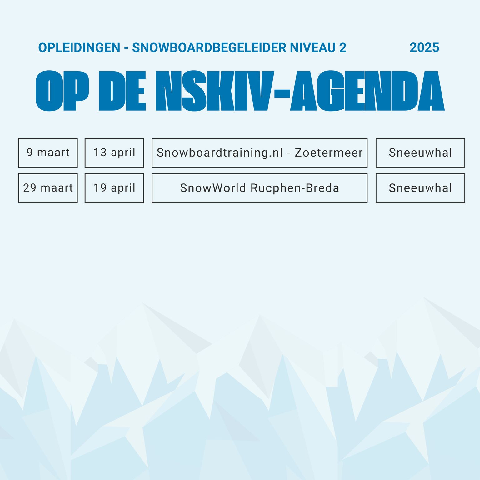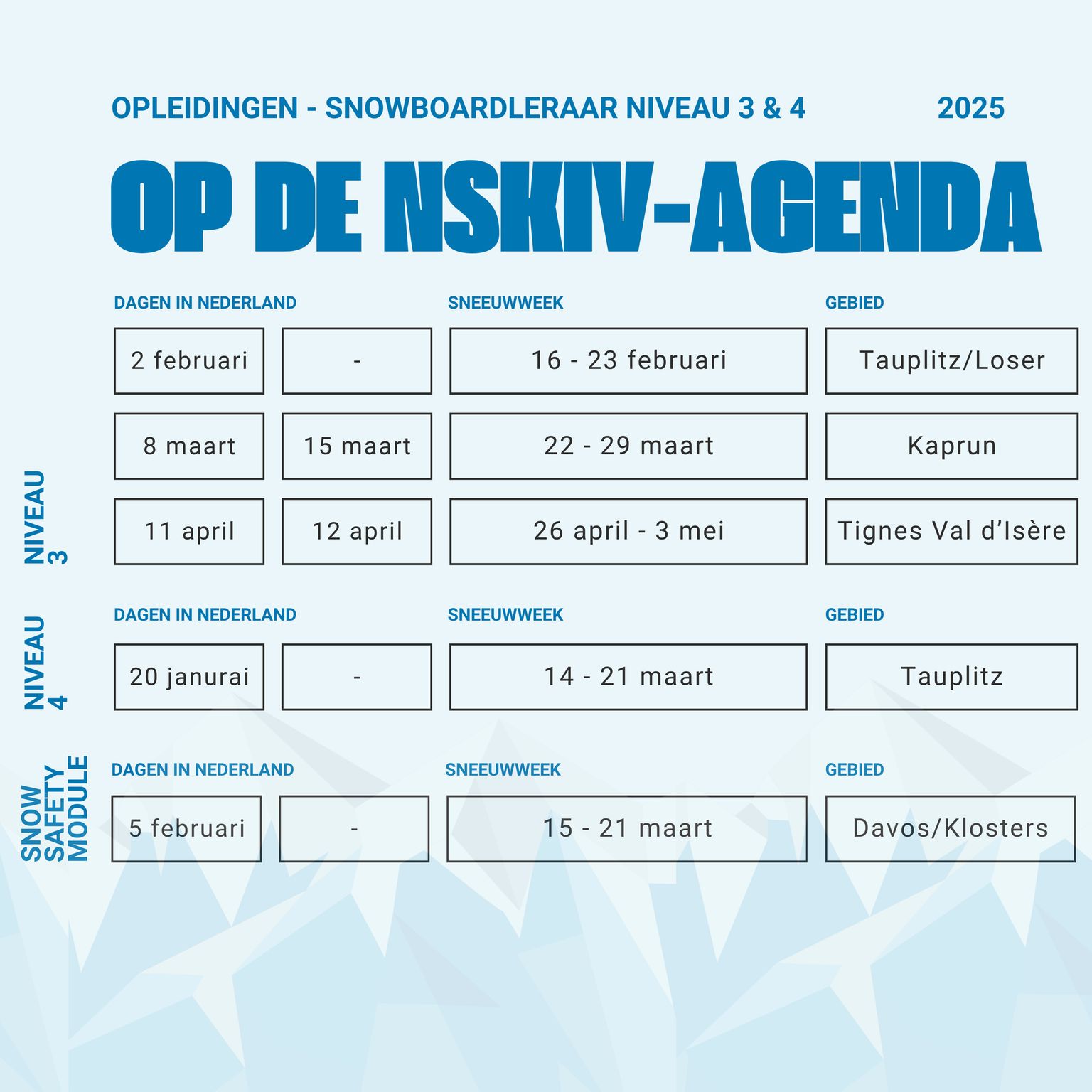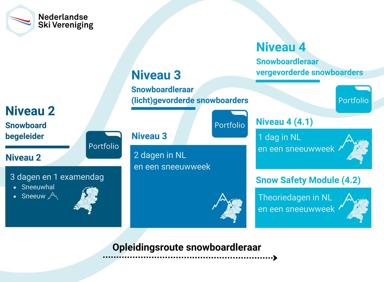 Het pad naar een echte pro begint gewoon in Nederland, met de niveau 2-opleiding. Daarmee krijg je een goed inkijkje in het lesgeven en ontdek je of het echt iets voor jou is. Heb je dan de smaak te pakken? Dan kun je doorstromen naar de vervolgopleidingen. We laten je zien welke route jij kunt doorlopen als toekomstig ski- of snowboardleraar en wanneer de opleidingen plaatsvinden. Wie weet sta jij binnenkort voor een groep, klaar om jouw passie voor wintersport te delen!