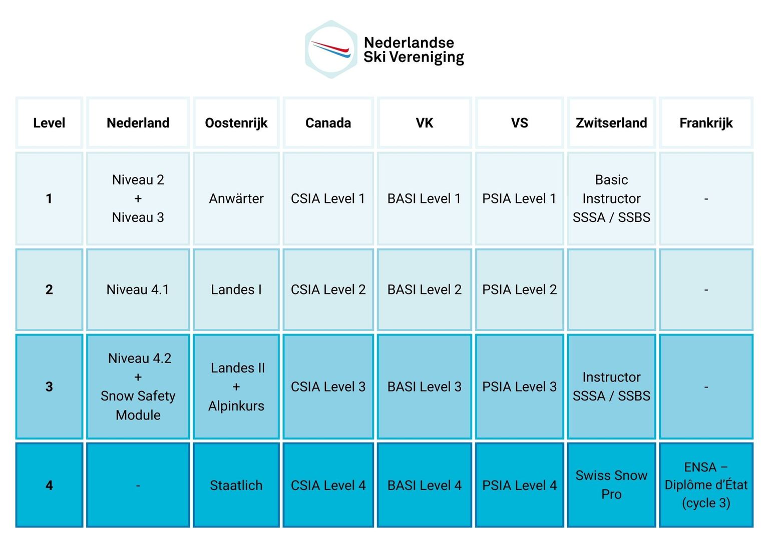 In theorie komen de diploma’s overeen zoals in het schema hieronder. In de praktijk geven landen vaak de voorkeur aan hun eigen diploma’s. Daarom is het goed om te weten dat de NSkiV contact heeft met verschillende buitenlandse skischolen en hierin kan meedenken. Heb je hier vragen over? Neem dan contact met ons op via [email protected].