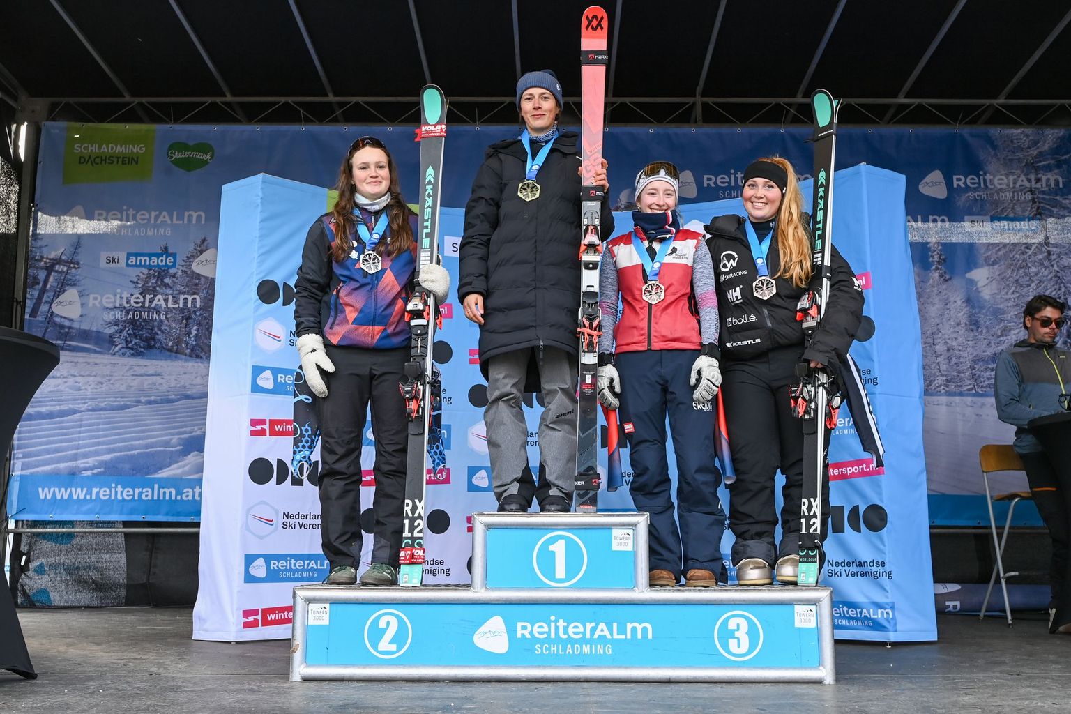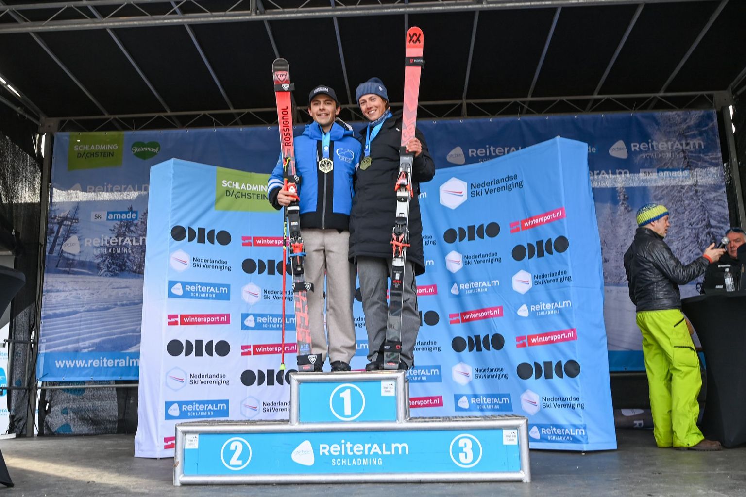 Vandaag was dus de eerste NK wedstrijd van de week. Tussen het Nederlandse deelnemersveld zaten drie TeamNLsnow-atleten en wel zeven (!) NextGen-atleten. Bij de dames ging de strijd tussen Noa Blok en Noa Rabou. Helaas maakte Rabou in de eerste run een foutje waardoor ze niet finishte en dus uit de strijd lag voor de Nederlandse titel. NextGen-atleet Myrthe Jager ging vooraf aan de wedstrijd niet uit van een hoge plaats, omdat ze niet veel reuzenslalom heeft getraind dit seizoen. Ze zetten twee sterke runs neer en eindigde op de tweede plaats. Sterre van den Berg en Nora Halvorsen maakte van dit podium een extra speciale: de dames skieden namelijk allebei exact dezelfde tijd! Sterre: “Ik vind het hartstikke leuk om samen met Nora op het podium te staan.”