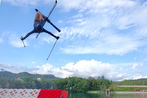 Augustus 2025 - Het is een mooie zonnige ochtend in Villach. Terwijl de meeste Nederlanders alleen een zwembroek aantrekken om te gaan zwemmen in de meren van Karinthië (Oostenrijk), nemen de beste buckelpiste-skiesters van Nederland een duik met skischoenen en ski’s aan!