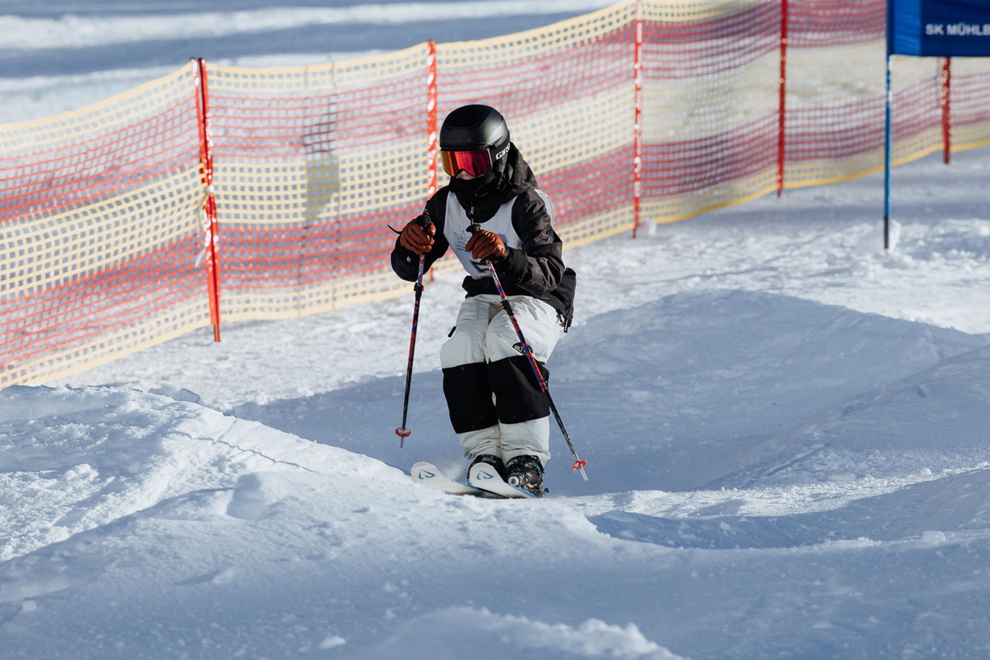 Slalom Het onderdeel slalom wordt over het algemeen geskied op een piste met een hoogteverschil tussen de 150 en 200 meter. Het traject wordt gekenmerkt door korte opeenvolgende poortjes (met twee palen) afgewisseld in de kleuren rood en blauw. De snelste totaaltijd van twee manches bepaalt de uiteindelijke winnaar.